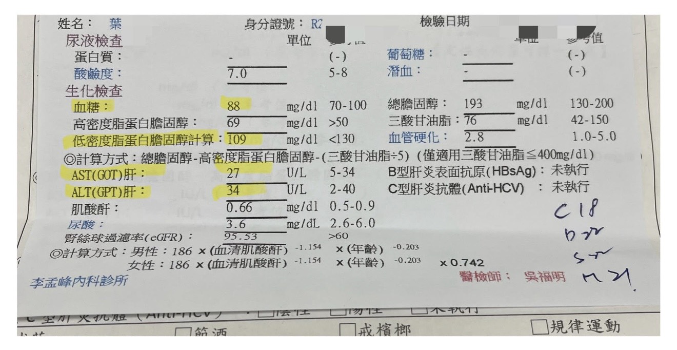✅65歲的Y女士,有新陳代謝症候群,健康檢查:低密度脂蛋白-膽固醇(壞的膽固醇)144 mg/dl(正常值應小於130mg/dl),血糖:105 mg/dl(正常值應小於100mg/dl),肝功能異常,GOT:141U/L(正常值應小於34 U/L)、GPT:143 U/L(正常值應小於40 U/L)。