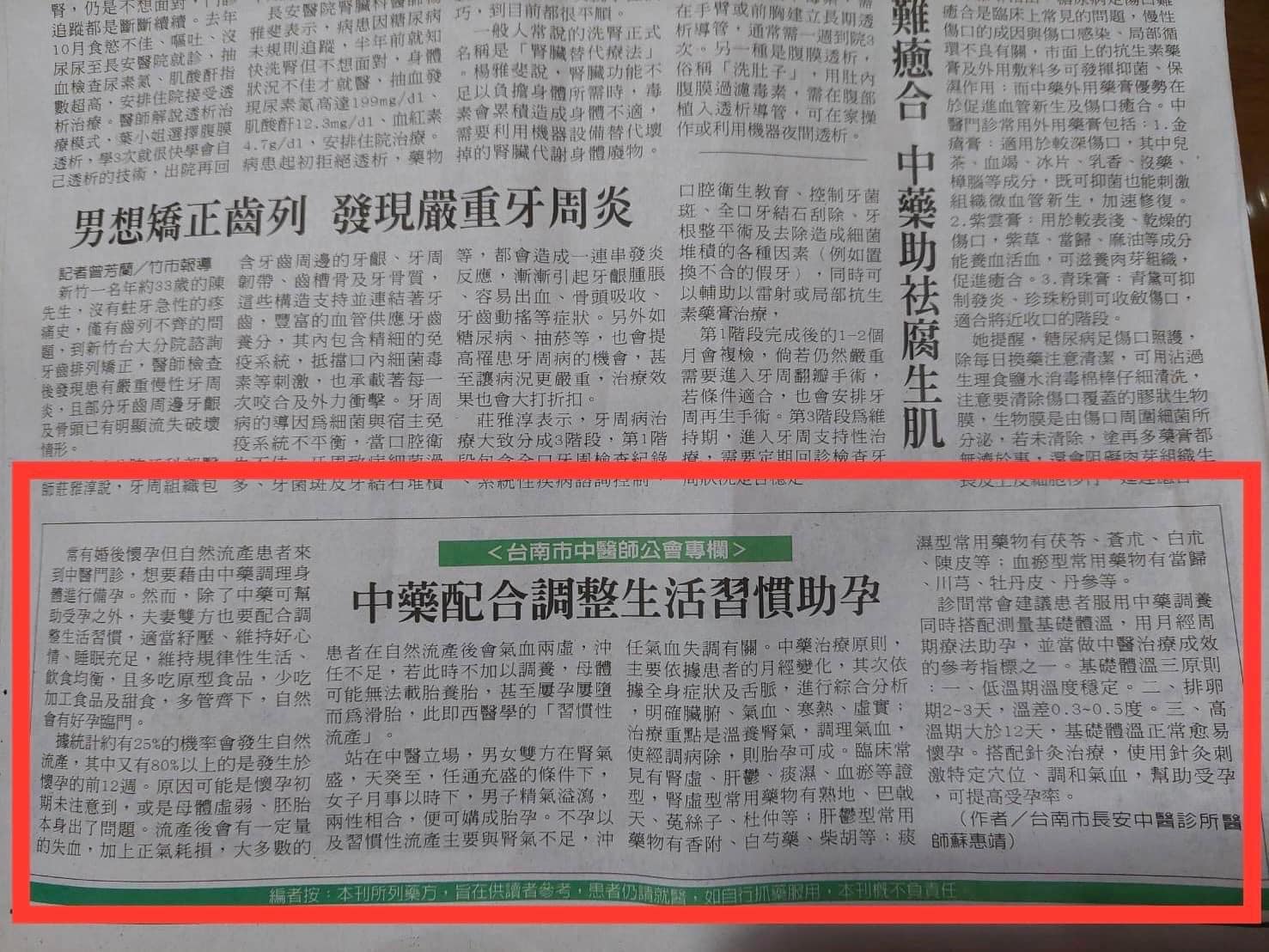 感謝中華日報刊登蘇醫師的不孕專題文章